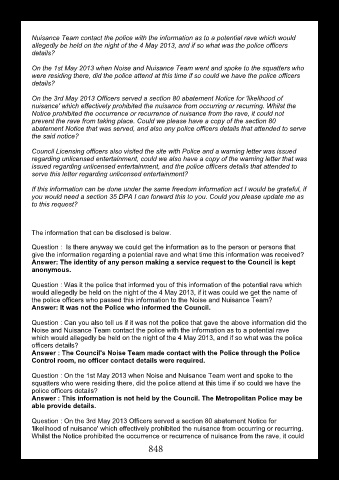 Question : On the 1st May 2013 when Noise and Nuisance Team went and spoke to the