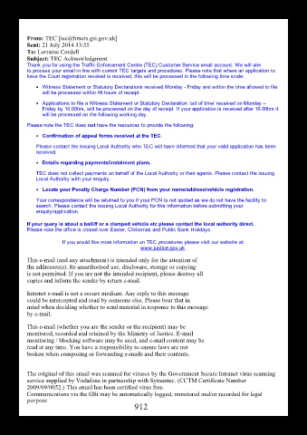 Thank you for using the Traffic Enforcement Centre (TEC) Customer Service email account. We will aim