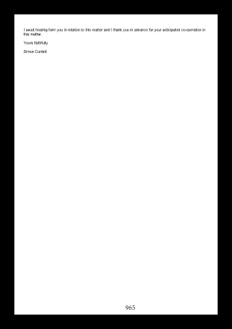 I await hearing form you in relation to this matter and I thank you in advance for your anticipated cooperation in this matter. Yours faithfully Simon Cordell 965