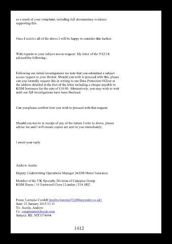 With regards to your subject access request. My letter of the 9/12/14