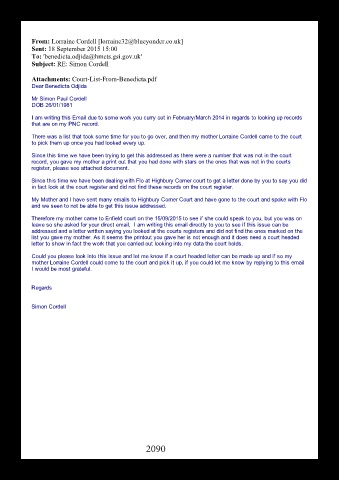 Therefore my mother came to Enfield court on the 15/09/2015 to see if she could speak to you, but you was on