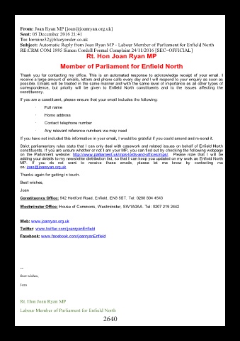 Subject: Automatic Reply from Joan Ryan MP Labour Member of Parliament for Enfield North