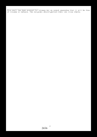 ________________________________ This email has been scanned for viruses but we cannot guarantee that it will be free of viruses or malware. The recipient should perform their own virus checks. 2 2656