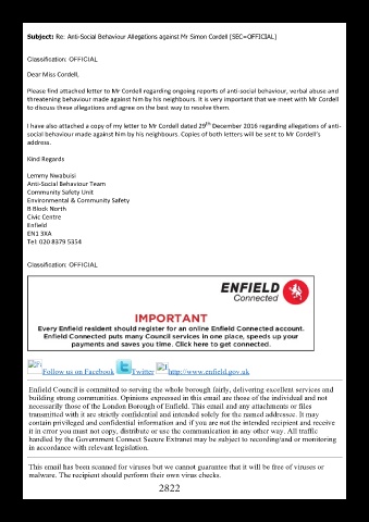 social behaviour made against him by his neighbours. Copies of both letters will be sent to Mr Cordell’s