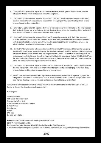 7. On 12/12/16 Complainant B reported that on 11/12/16, Mr Cordell came and banged on his front