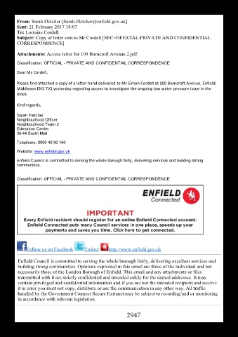 Please find attached a copy of a letter hand delivered to Mr Simon Cordell at 109 Burncroft Avenue, Enfield,