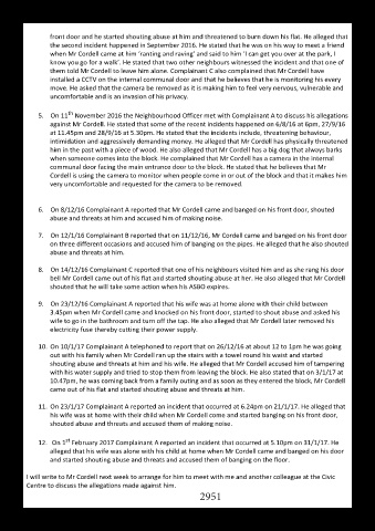 6. On 8/12/16 Complainant A reported that Mr Cordell came and banged on his front door, shouted