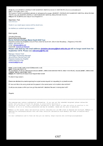 To: Lorraine Cordell; records@behmht.nhs.uk; InformationGovernance (BARNET, ENFIELD AND HARINGEY MENTAL HEALTH NHS