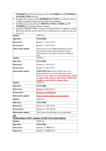 • 03:00hrs Calls received from C BROWN (CW03), S GRIEG and P