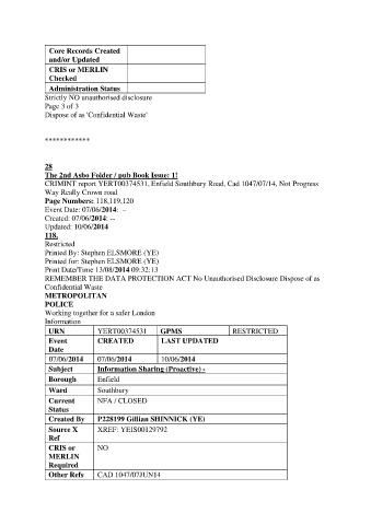 CRIMINT report YERT00374531, Enfield Southbury Road, Cad 1047/07/14, Not Progress