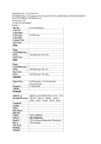 INCIDENT Mo. 1722 entered at 03:58 cn 07JUN14 by CHS/CHS in CCC/IR INCIDENT