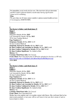Mother has crisis number and is in regular contact with Simon. She confirmed that he has