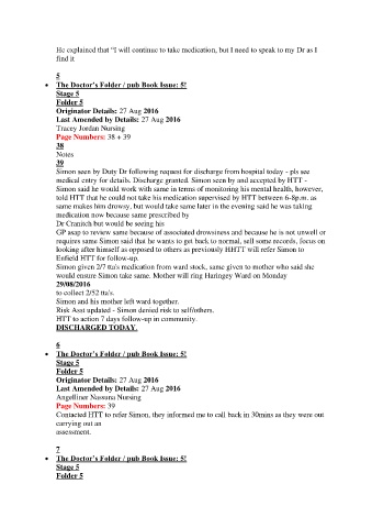 medical entry for details. Discharge granted. Simon seen by and accepted by HTT -