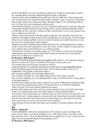 On the 25/01/2016 the Mental Health team applied to the court for a 135 warrant to enter my