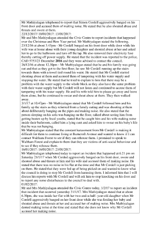 Mr Mathiyalagan telephoned to report that Simon Cordell aggressively banged on his
