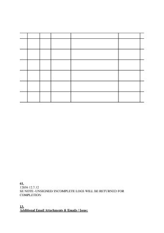 61, 12856 12.7.12 SE NOTE -UNSIGNED/ INCOMPLETE LOGS WILL BE RETURNED FOR COMPLETION 13. Additional Email Attachments & Emails / Issue:
