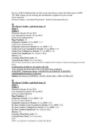 Service. If Mr Cordell presents in crisis at any time please contact the Crisis team on 0208