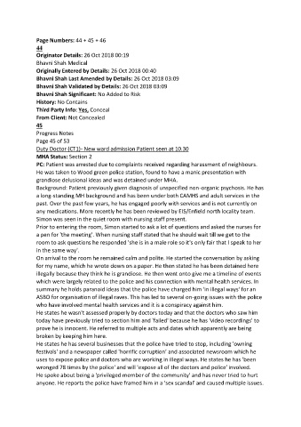 PC: Patient was arrested due to complaints received regarding harassment of neighbours.