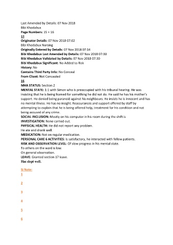 MENTAL STATE: 1:1 with Simon who is preoccupied with his tribunal hearing. He was
