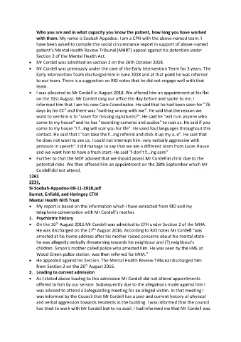 • On the 16 August 2016 Mr Cordell was admitted to CFH under Section 2 of the MHA.