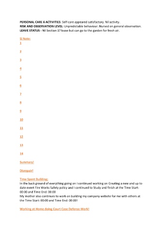 PERSONAL CARE 6 ACTIVITIES: Self-care appeared satisfactory. Nil activity.
