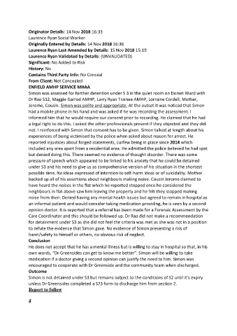 Simon was assessed for further detention under S 3 in the quiet room on Dorset Ward with
