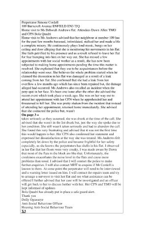 Home visit to Ms Andrews advised that her neighbour at number 109 has