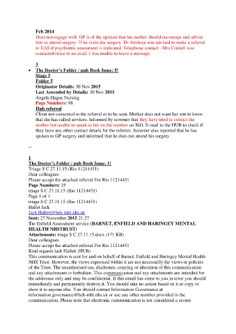 mother but unable to speak to her on the number on RiO. E-mail to the HUB to check if