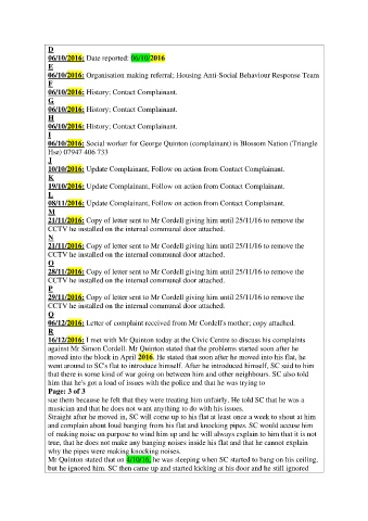 Mr Quinton stated that on 4/10/16, he was sleeping when SC started to bang on his ceiling,