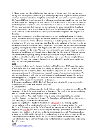 3. Allegations of Anti-Social Behaviour You referred to alleged issues that your son was